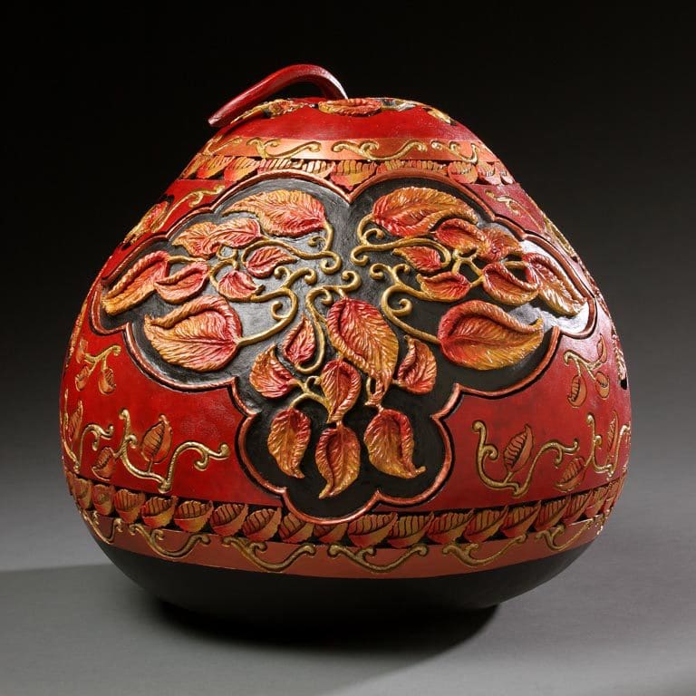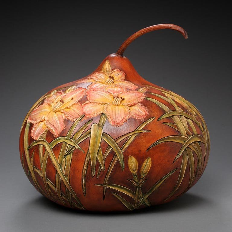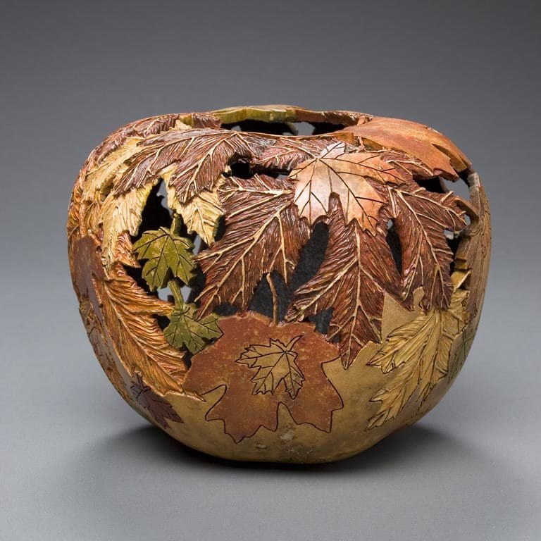 I’m in awe of the talent of these two ladies. I’ve done a bit with gourds and it’s hard work. I can’t imagine the expertise it takes to cut these out, add the rich texture, etc. I just love their work.