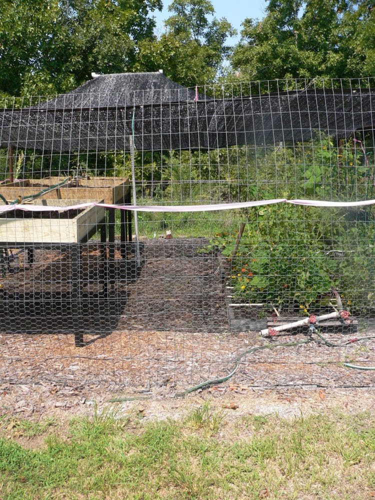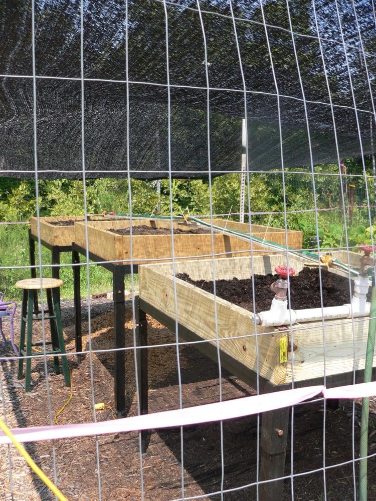 This picture is taken from the West end of the garden, looking East, so you get an idea of the three 4’x4′ wooden raised bed garden boxes on metal supports on the south side of the garden. Each box is filled with Mel’s Mix (vermiculite, peat moss, and three or more kinds of compost. We use mushroom, barnyard, and cotton burr.) The screws you see sticking up on the edges of the box are for string to be stretched across from both directions to create the square foot planting areas. We put 1×2’s across the whole length of the three boxes to support the sprinkler in the center of each box and the hose lengths going from one sprinkler to the next.