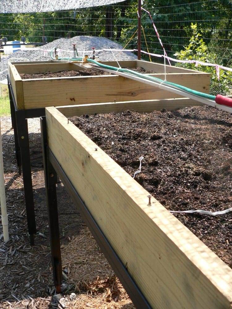 As you can see, the metal supports didn’t allow for the boxes to be at exactly the same level as the others. We settled for LEVEL at whatever height that was. You can also see here that I need to mix more Mel’s Mix tonight to fill up the third box. I also need to spread wood chips under the three raised bed boxes.