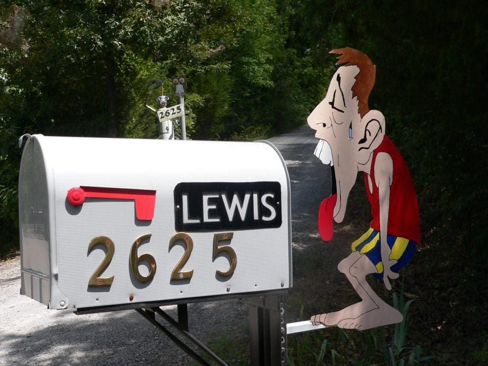 The heat index today is 113 degrees F., so this seems an appropriate decoration for our mailbox. This is called, “Hot Man.” This is the back of the decoration. You can see where I was trying to blend in the attachment bracket, plus a strenthener rod that went from his heel up to his waist.