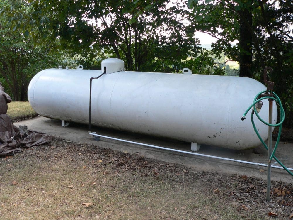This is our 1000 gallon propane tank after pressure washing. It looked a LOT better than it did, but paint was peeling and we had to repaint. My husband thought we should paint it white again. I decided that was boring and looked for other ideas.