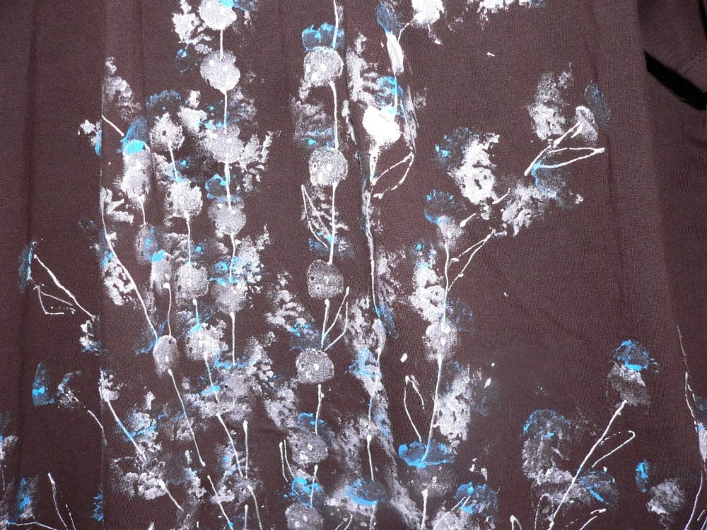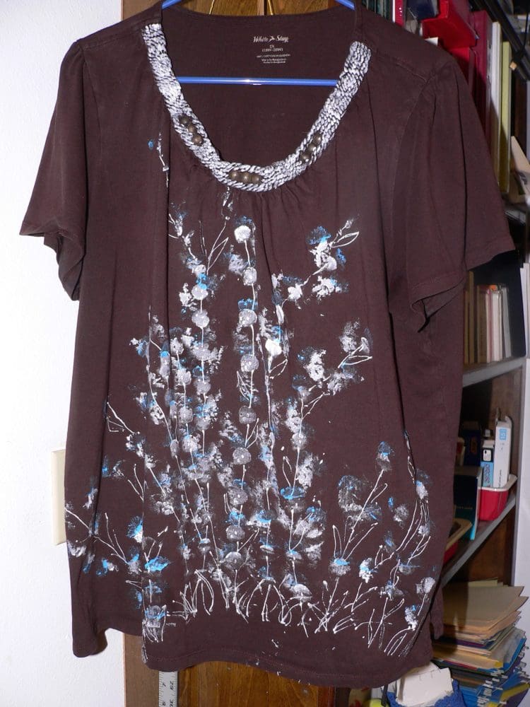 I had fun painting a brown tee with white puffy ‘flowers.’ Then I looked at the shirt and decided it didn’t look ‘finished,’ so I put more white flowers on it. On looking at it again, I decided I thought a powder blue would add something. So I did that yesterday.