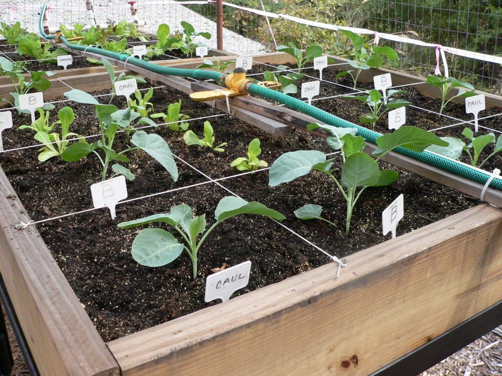 The 2nd raised bed has cauliflower, broccoli, and some head lettuce.