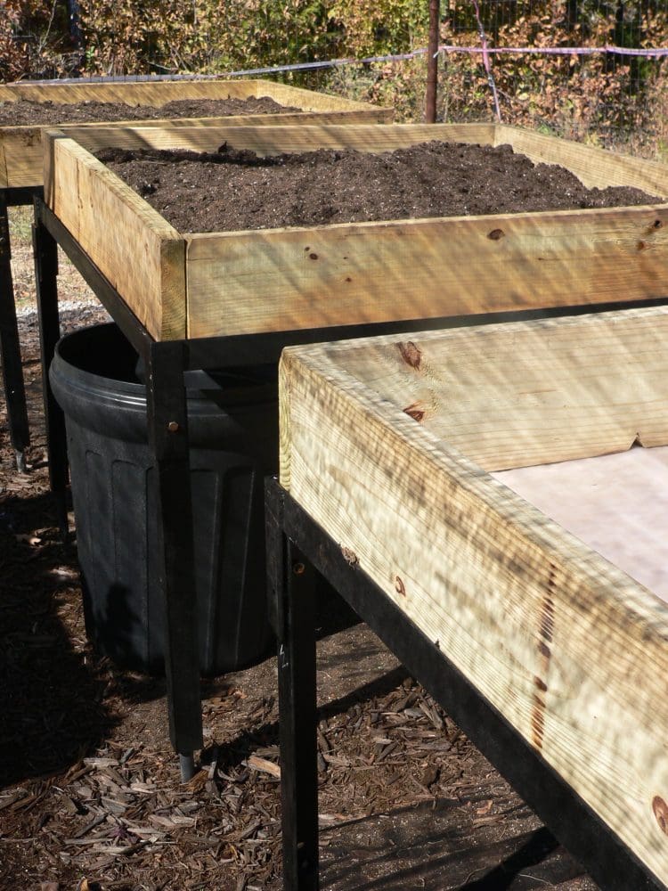 I just came in from working out there. I put the Mel’s Mix into the last planter. I’ll top these three off before I plant in the spring. I also measured off 1 foot measures all around the top of the three planters and put in screws. We’ll use these when we stretch string in both directions to mark the squares for planting.