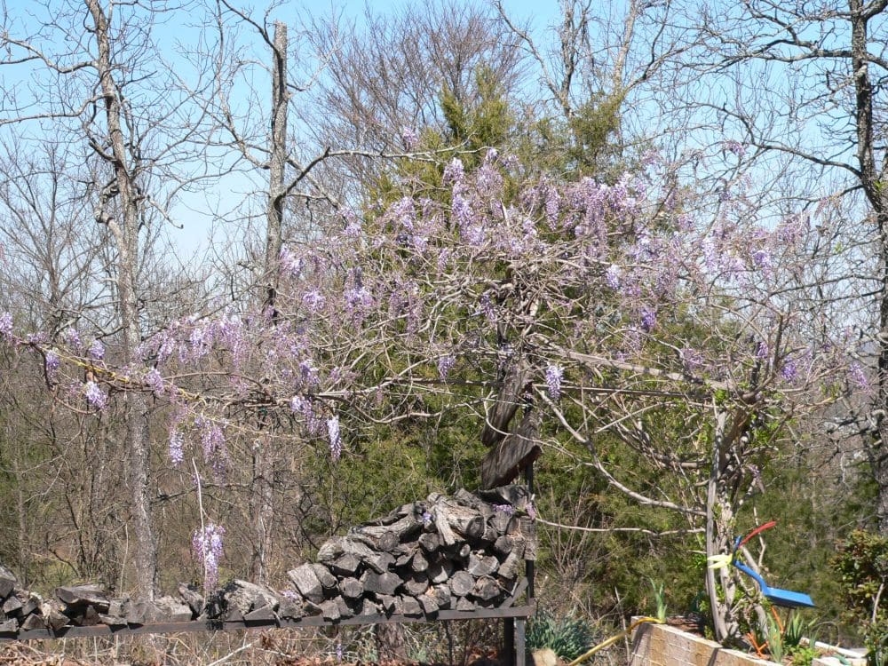 We have kind of an L-shaped area from the intersection of a row of brick planters and one of the firewood holders we made. We planted the wisteria plant in the end of the planter closest to the woodpile. Over the past few years, as it grows, we keep trying to anchor it so that it will cover all the way over to the driveway.