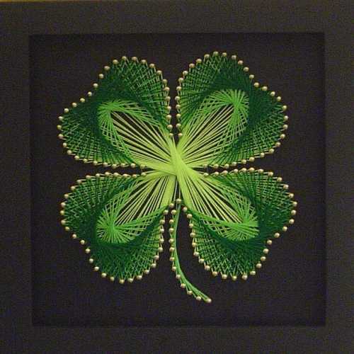 This seems simple, but if you look carefully, there are four different shades of green string used. I also love the gold brad type nail heads to outline the shamrock.