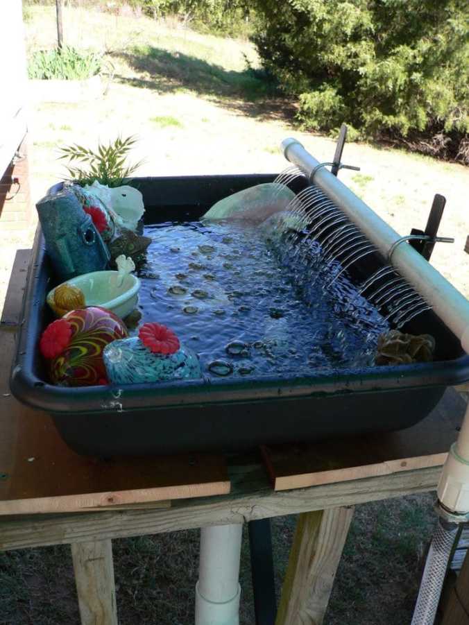 (1) Our hummingbird bird bath is proving to be quite a challenge. We’ve tried several different approaches to getting the water to circulate, but not leak. Today we installed a regular toilet float valve in the trashcan under the bird bath. we hooked everything up, smiled, and then frowned again because it was leaking from the flapper valve in the tub. We have again drained it, leaving all the rest of the system intact. We’re going to spray all around the flapper valve with FlexSeal – the stuff on TV that’s supposed to repair holes in boats, etc., to see if that will solve our problem. We’re also going to shorten the flexible hose we have that goes from the bottom of the tub to the trash can. We’ll let the FlexSeal dry, and then we’ll test the system again. We’re SO close to having something that we can set and forget – except for extreme enjoyment. Fingers crossed!