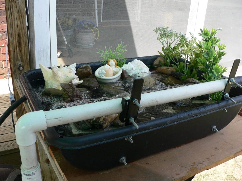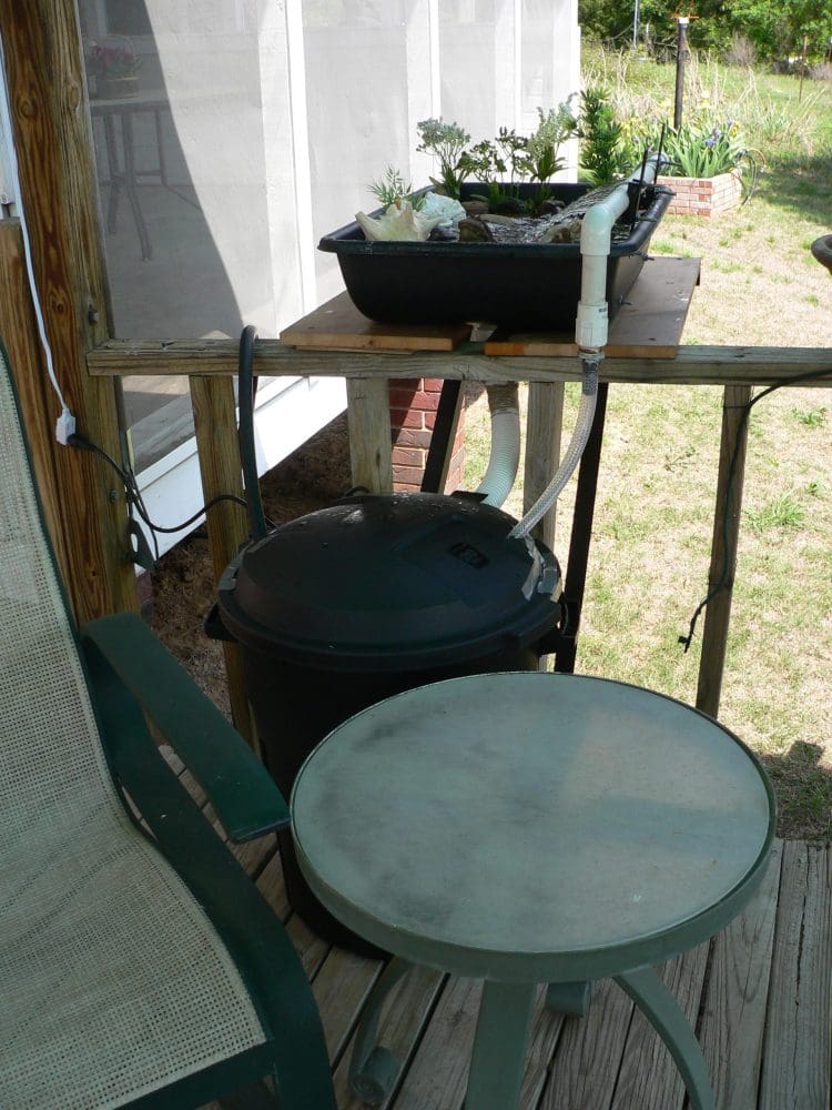 Here is the set up. You can see the tub above and the trash can on the deck under the tub. The garden hose is always on. There is a float valve inside the can that will trigger the hose to add more water if the level in the can gets too low. The float valve shuts off the water when it’s happy with the level.