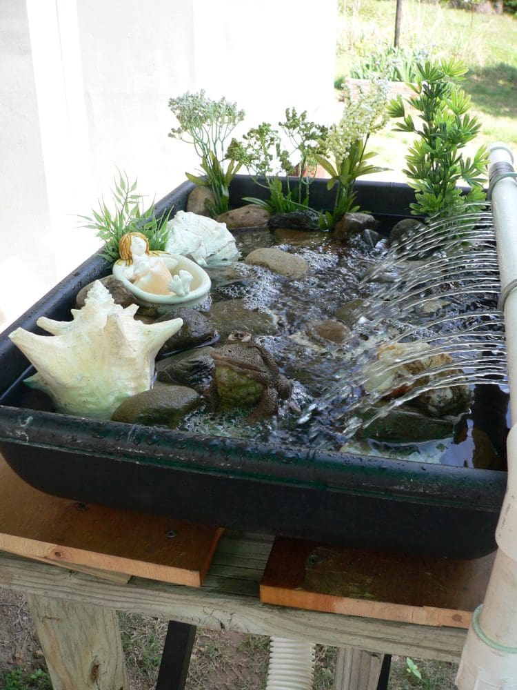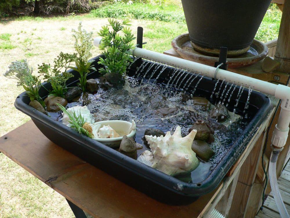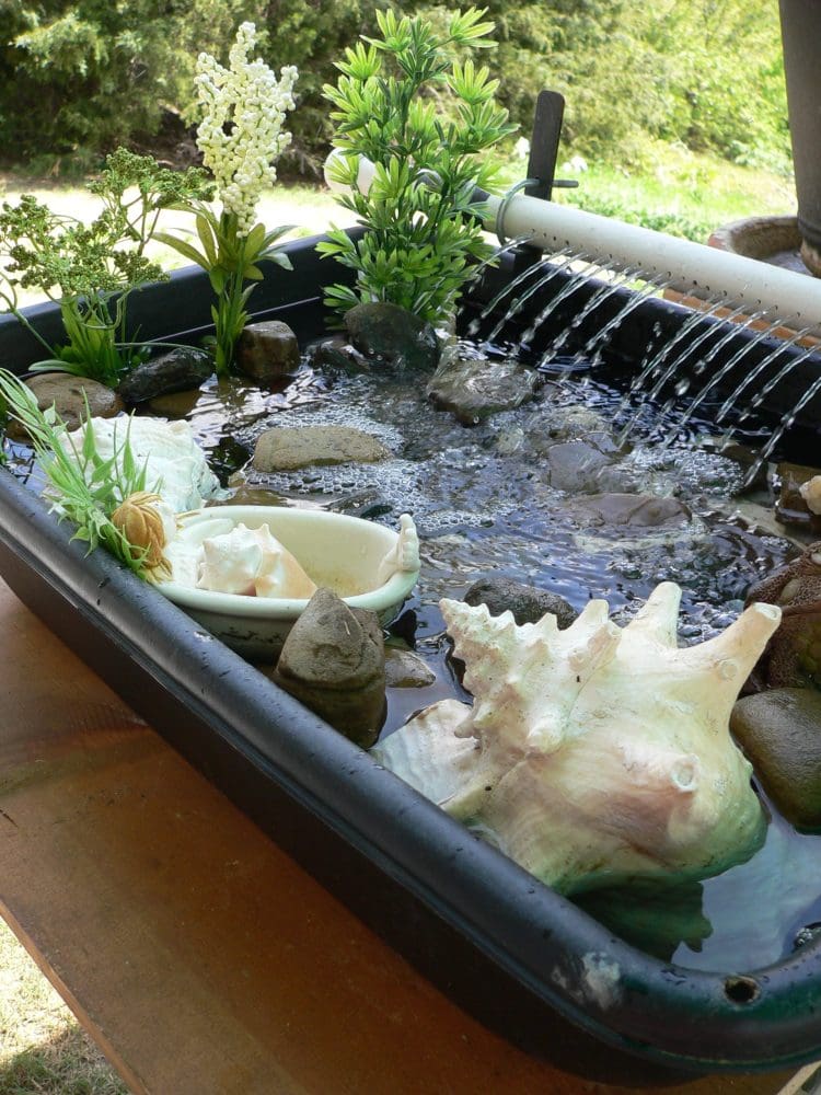 The water is attached to a timer. We decided to run it during daylight and let the pump rest when it’s dark, so no skinny dipping or midnight swims for the little hummers. They can always stand in the water in the tub, but there won’t be a waterfall during the night.