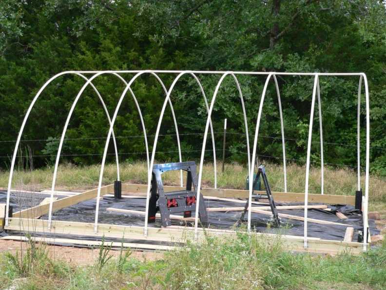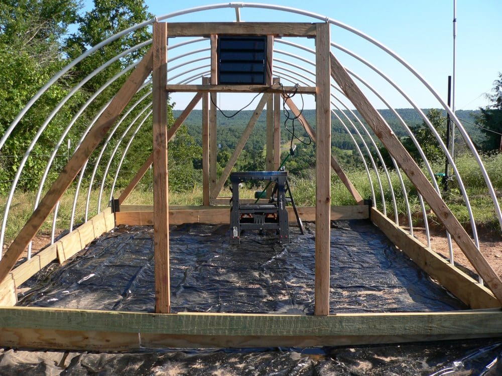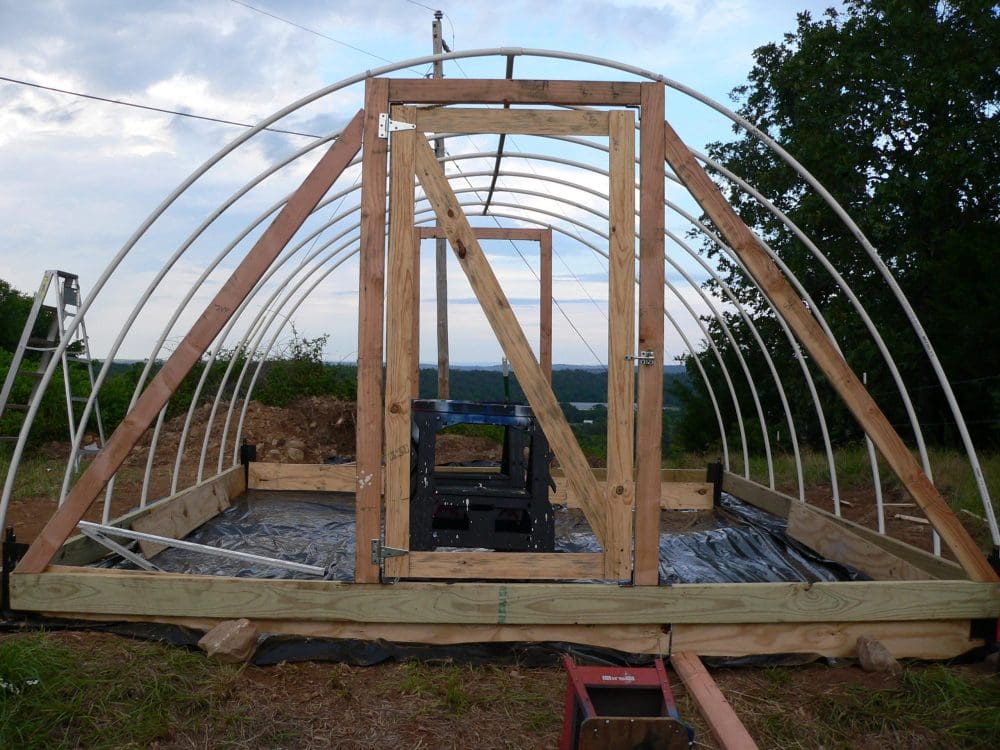 This picture doesn’t show that we finished the framework of the greenhouse, adding the exhaust fan to the doorway on the opposite end, some structural supports, etc.