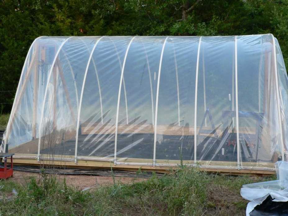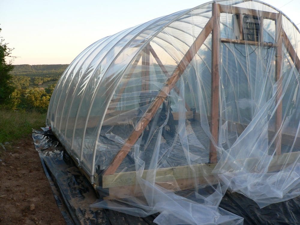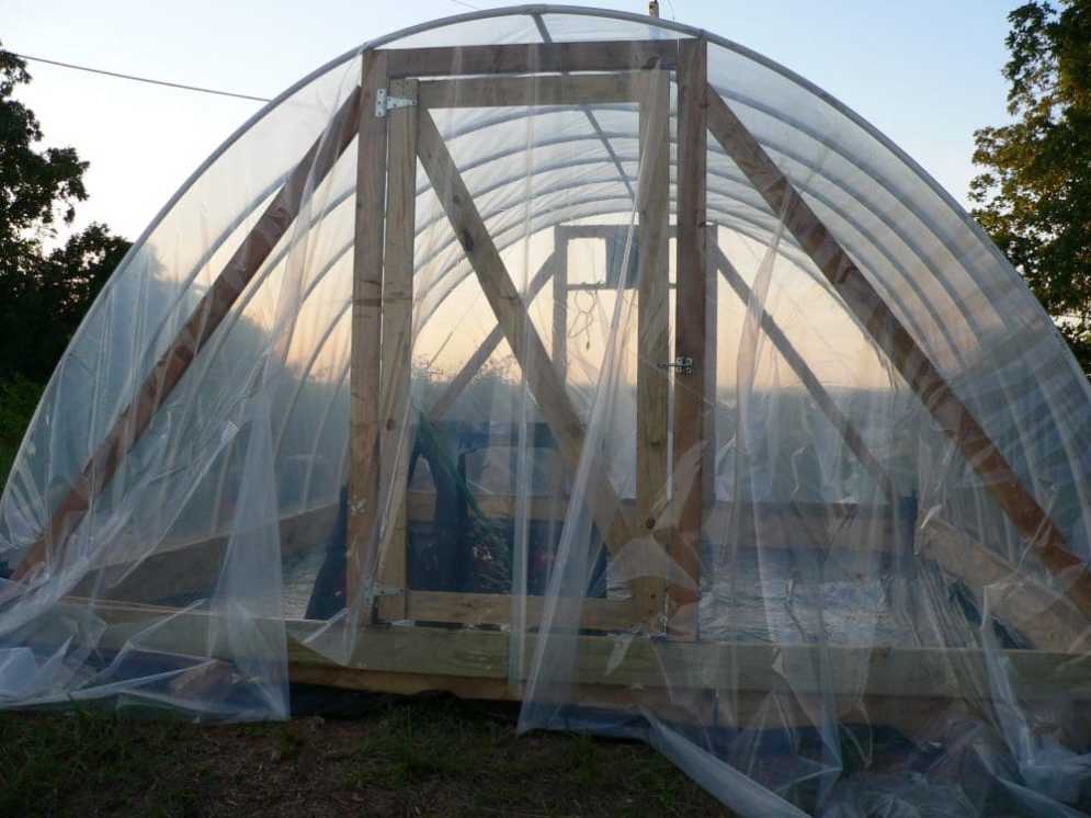 We put a few staples on the film to hold it to the exhaust fan end of the greenhouse.