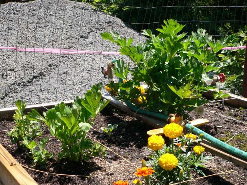 Here is celery I started inside by cutting off the bottom 2″ of the stalks I bought from the store, putting them in water, and then transplanting them to the garden. I’m not getting neat ‘stalks’ like you buy at the store, but the plants look healthy. I’m not sure if I should cut off individual stalks as they grow or what. It sure is fun watching them grow, though.