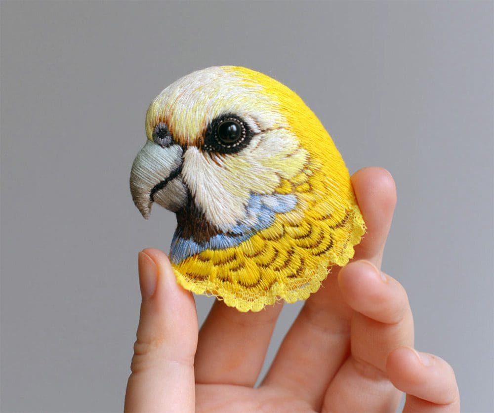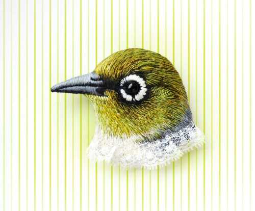 “Warsaw-based embroidery artist Paulina Bartnik stitches colorfully lifelike brooches of birds and other tiny creatures in a dense style called needle painting. Each object begins as a piece of wool which she prods with a special needle in a process called dry felting which results in a surface ideal for embroidery. She then paints with a needle directly on the felt and embroiders the finer details.”