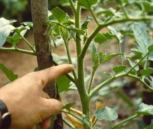 I just found a good video of a man trimming his fairly early tomato plants. He pinched off the lower branches that touched the soil, saying that you can stop a lot of disease if you do this. He was also pinching off the sucker (he’s pointing to one here) early on to make the main part of the plant sturdier.