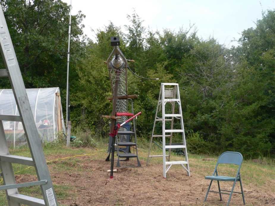 We took a short break at my insistence. I was rattled when the thing came crashing down, picturing all sorts of awful things that could have happened. Once the ladders were providing a bit more security, we tackled it again. We needed to get it up another 6 to 8 inches for the antenna to be able to rotate freely.
