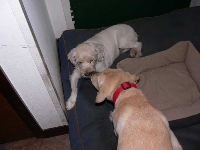 Here are Molly and Amber on the dog bed in the utility room. Molly definitely has a defensive posture, but Amber is slowly making her realize Amber doesn’t want to hurt her.