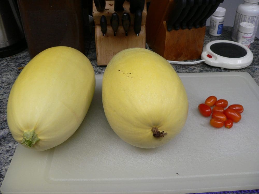 When I bought one from the store, I washed the seeds and dried them. This spring I planted a couple of seeds in the house in small pots just to see if they would sprout. Not only did they sprout, they did well enough I transferred the plants into my raised bed square foot garden. The plants continued to do well, making yellow blooms and vines. As the other things in the garden came out, I just let the vines go where they wanted to in the squares. I harvested these two today. They’re almost as large as the ones I buy at the store. I have at least three more in the garden, and this was from TWO seeds! I also got a handful of ripe grape tomatoes to add to my stash. :0)