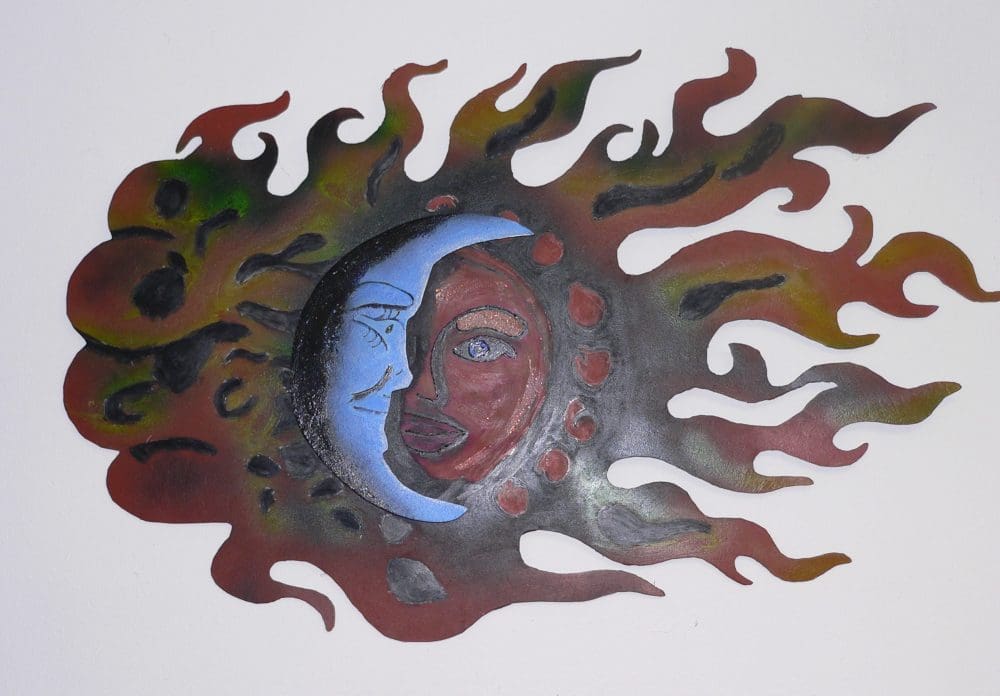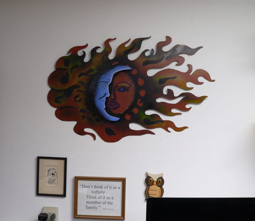 We just hung up the Sun/Moon Metal Wall Hanging, pronouncing it finally, “Finished.”
