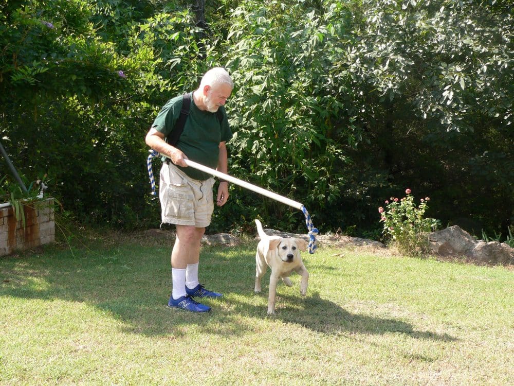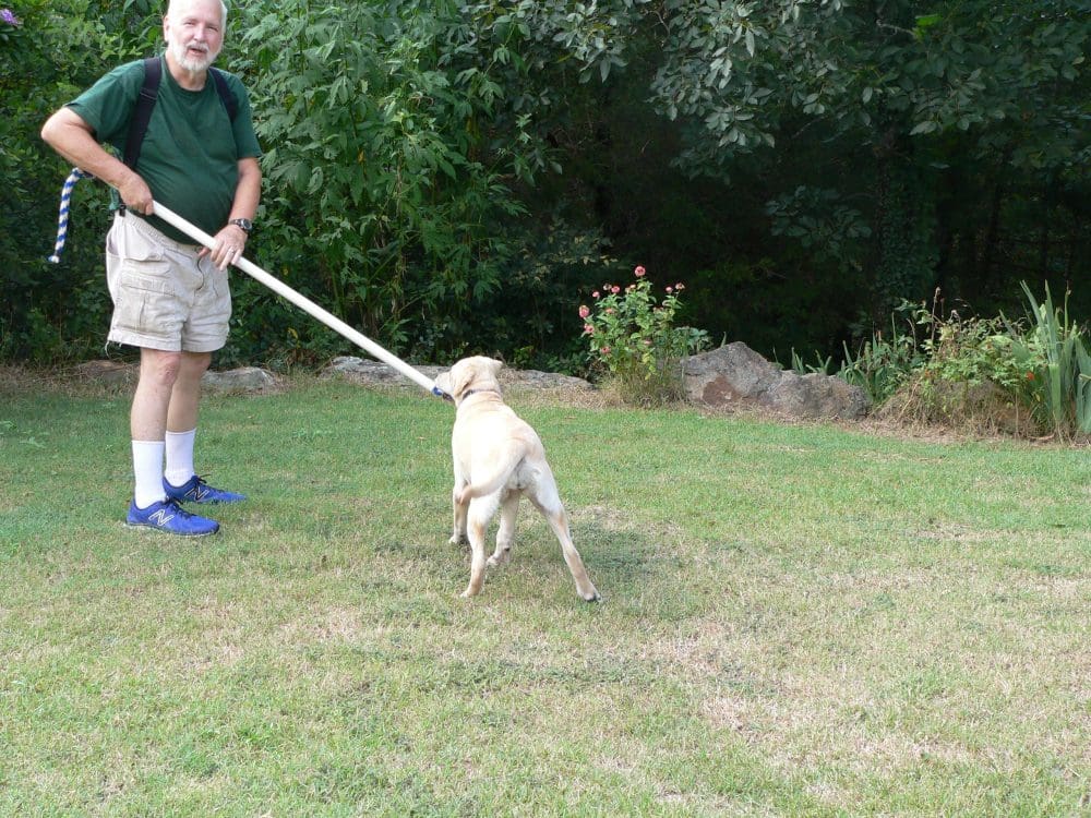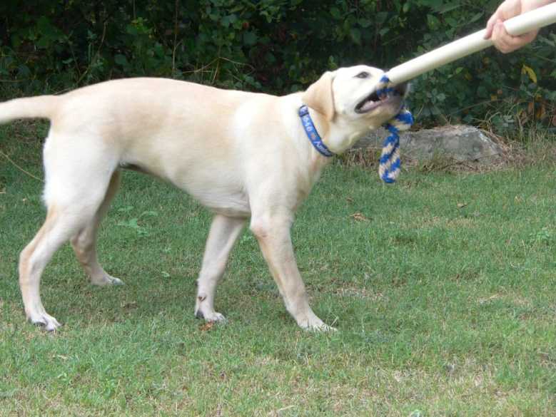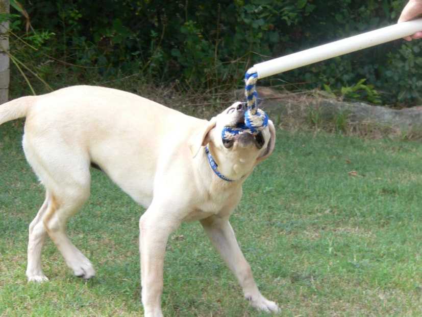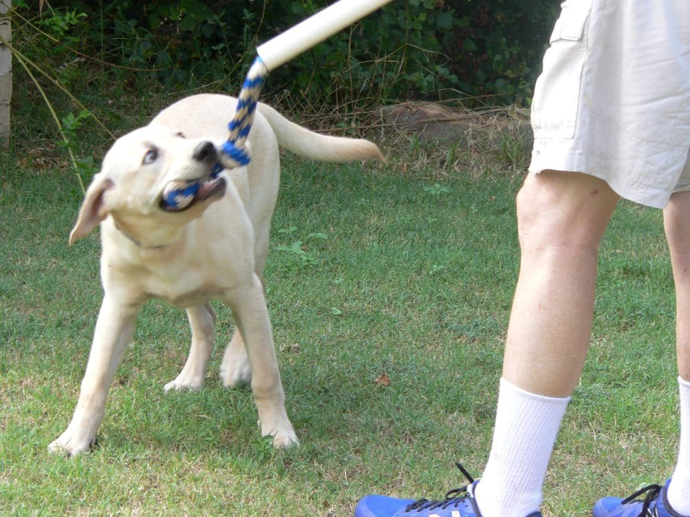 This toy is heavy nylon rope threaded through a length of PVC pipe. The rope is knotted, so it stays where it is. You hold the other end, shielded from the puppy’s teeth. Both of you get LOTS of exercise in short order.