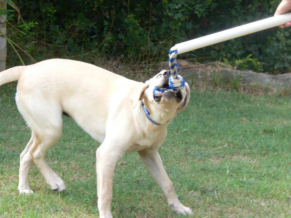 My husband made this toy for our pit bull, Bambi, years ago. I had forgotten we even had it, but my husband suddenly remembered it and found it in the garage. Tug of War is Amber’s favorite thing to do. She’ll bring us toy after toy, wanting you to grab the other end (if you dare with her sharp puppy teeth). She cheats, though, changing her bite and trying to grab YOUR end.