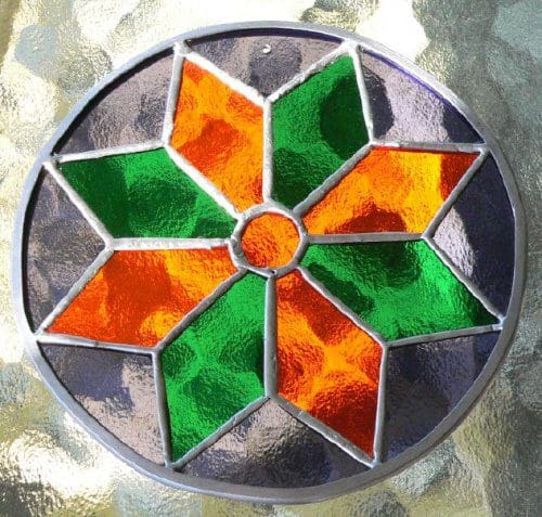 7.25″ in diameter. One-of-a-kind stained glass piece by Linda and Harvey Lewis. Glass pieces are cut by hand, ground, foiled, and soldered. Came is affixed to finish the outer edge nicely. Center is striated orange glass. “Star” is striated orange and striated green glass. Background is a nice striated purple. Design by George Rough. Hole drilled for hanging with fishing line in a window. You can also hang it on the wall, affix it to a cabinet, or set it on a table with a table easel.