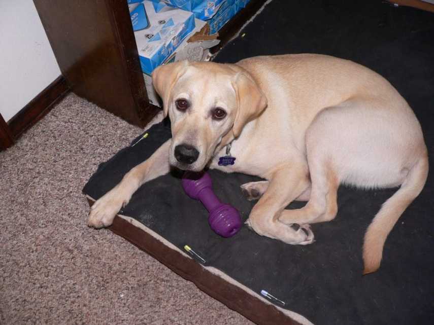 Amber with her purple bone on the office bed.