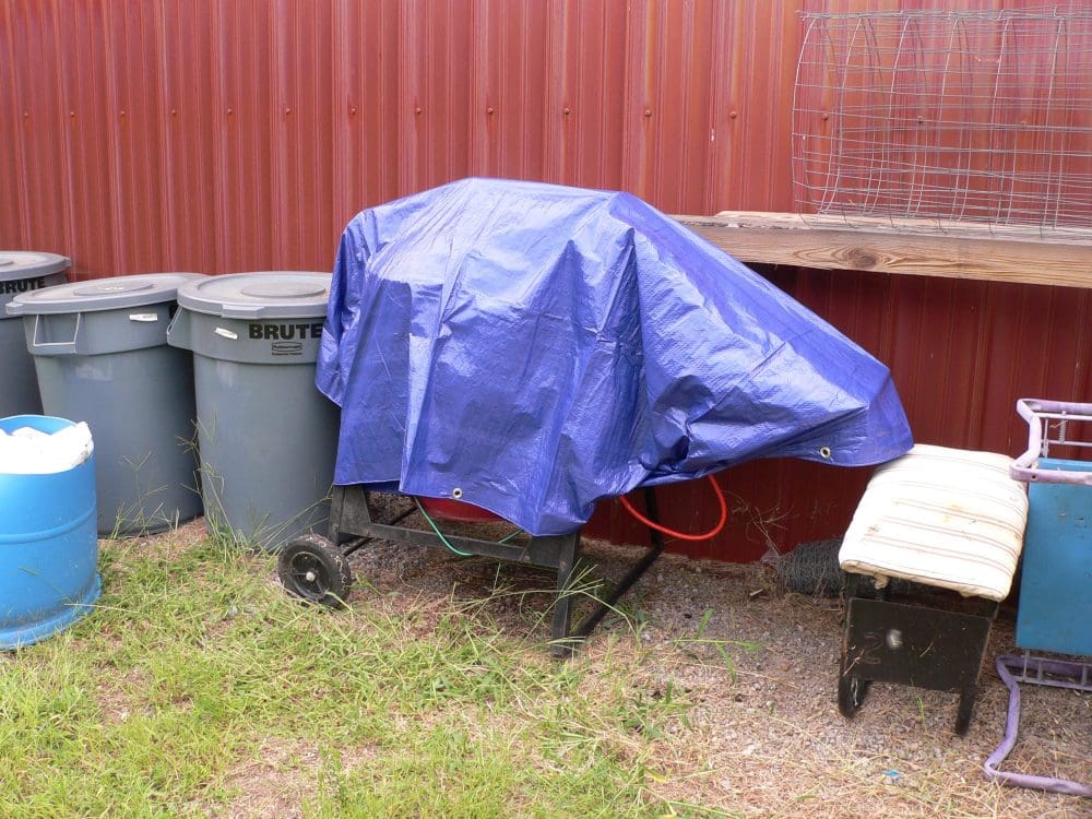 We used bungee cords to tie a tarp in place over the mixer to protect it and the extension cord from the elements.