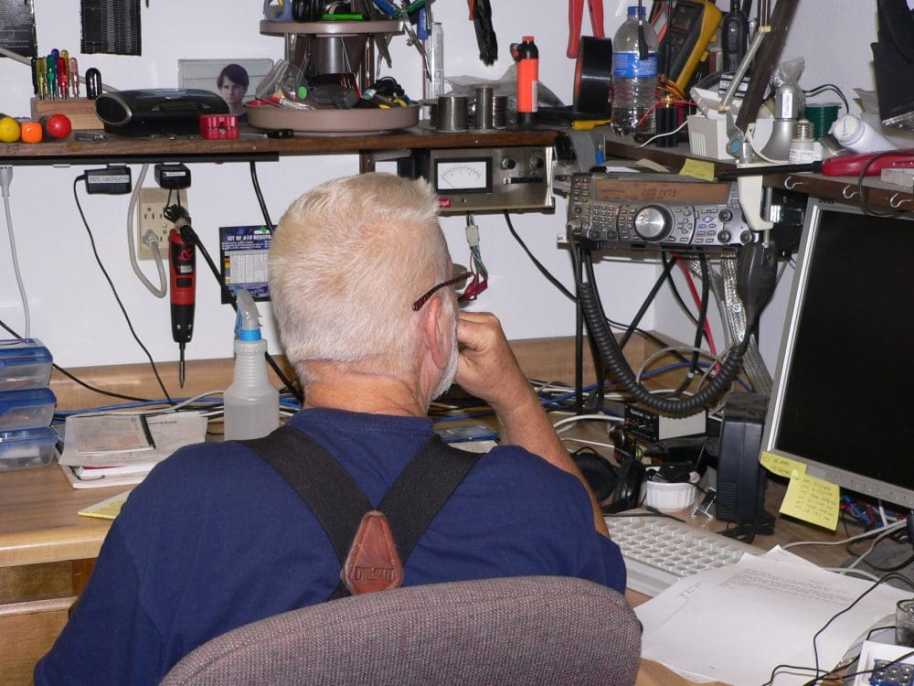 I surreptitiously took this picture of him this morning. He’s now having the stuff sync up (whatever that means.) I guess it’s making sure all the equipment, both physical and electronic, are on the same page. Then he’ll start a scan that goes through the whole band width from lower frequency to higher, listening for someone talking. (This will take quite awhile, so he’s playing tug of war with Amber.)