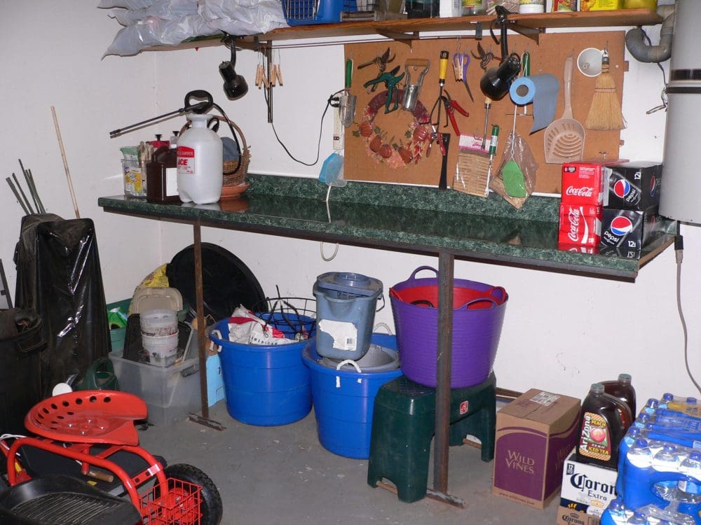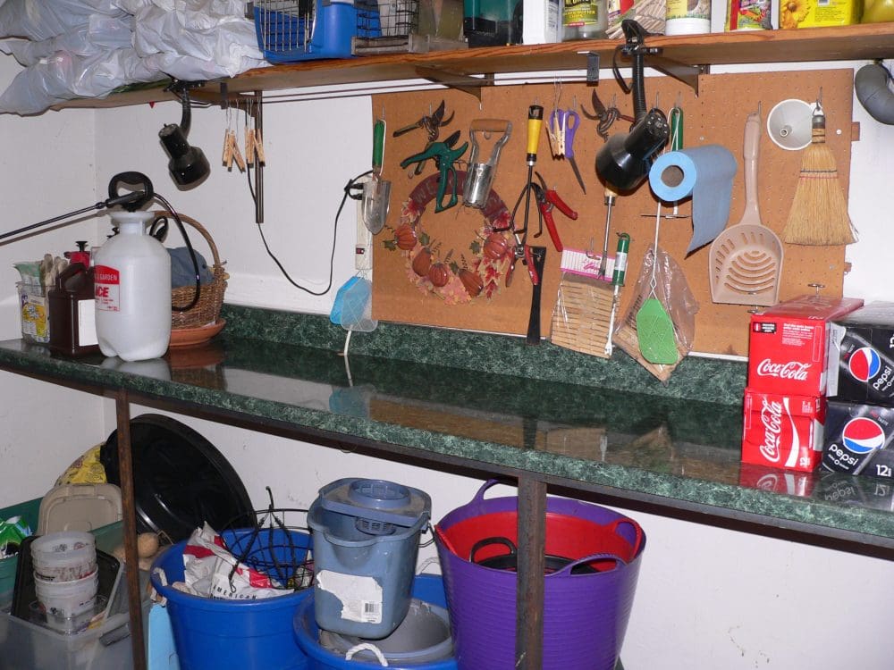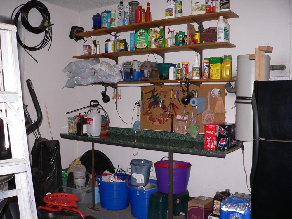 This is ‘my’ corner of the garage. As you can see, we put up some good, sturdy, shelves, a peg board on the wall, and some really nice counter top. There is a good amount of storage space under the counter top.