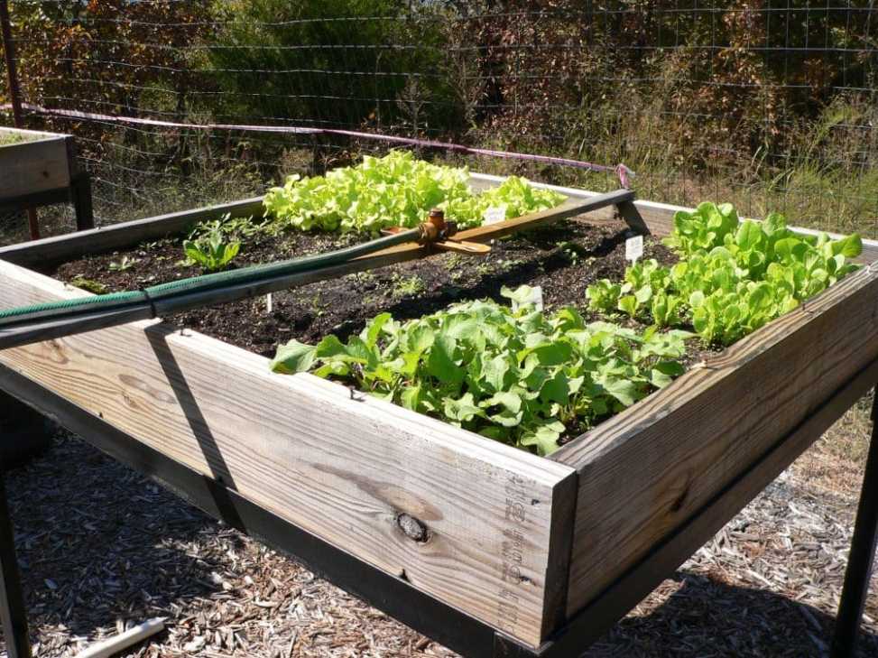 The raised bed square foot garden box above shows one single spinach plant, radishes, and two types of lettuce.