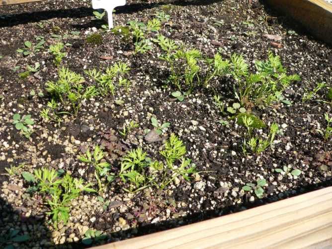 The parts of the boxes not overflowing with marigolds look like this. My strings that we strung to demarcate the squares in each box were killed by the combination of water and sun. I’ll use a different kind in the spring. I just went out and sprinkled seeds for the fall garden and hoped for the best.