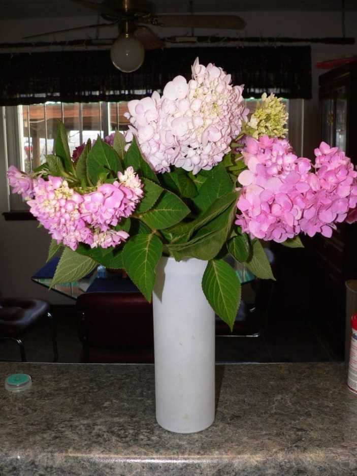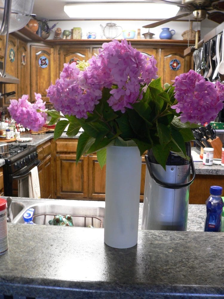 Since we’re due for a cold front overnight with off and on rain tomorrow, I decided to clean up one of our hydrangea planters, lopping off the branches that hang way down to the ground in front. I brought in some of the nicer blooms so that we could enjoy them in the house.