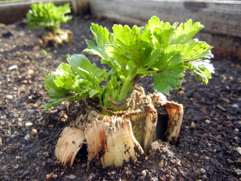 I just finished my planting for the day. I planted two celery plants from the bottoms I started in the house. (These are easy. Just cut off the bottom 2 inches of each bunch of celery and put them in a dish of water. When they have leaves showing well, transplant them to the garden.) If you want them to look like the bunches you get from the store, tie the little branches together with string. I just let them grow naturally, harvesting individual stalks when they look large enough.