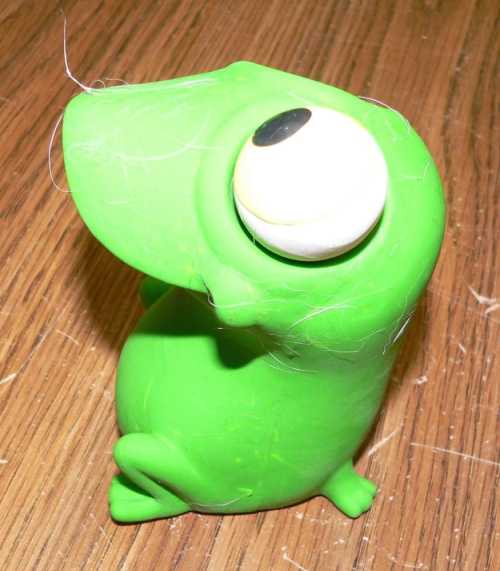 When we first got it, It’s made of soft rubber and squeaks. I thought it was really cute, but wouldn’t last long. I was wrong! It has lasted for about 3 months so far. She just loves it. She finally ate off one of the eyeballs, so it’s a one-eyed frog now, but seems to have many hours left in it. (sorry. I just tried to find the toy on the net so I could give you a URL for it, but I guess it’s been discontinued.)