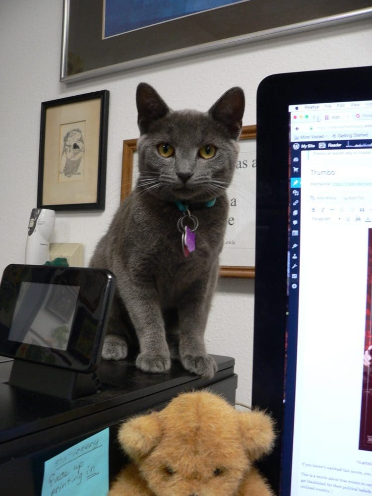 This is our computer helper, Smoke, the newest addition to our cat family. We found her at the vet’s. I went up to her and put my finger on the outside of the cage. She walked right over and tried to nuzzle my finger. I was gone. I dreamed about her, named her in my dreams, couldn’t get her out of my head. We went back and adopted her. My husband remarked that – for a free cat – she sure cost a lot, after we got her shots and got her spayed. She is quite the hunter. I’m trying to convince her that moles, voles, and other ‘oles’ are preferable to birds, but I’m not at all sure she’s convinced. Even though she’s a lot younger, she is the head cat, with Abby deferring to her on whatever she’s decided she wants. She’s also a techno-kitty, loving to sit on the printer, the counter beside my computer screen, the table beside the counter, or in my lap as I type.