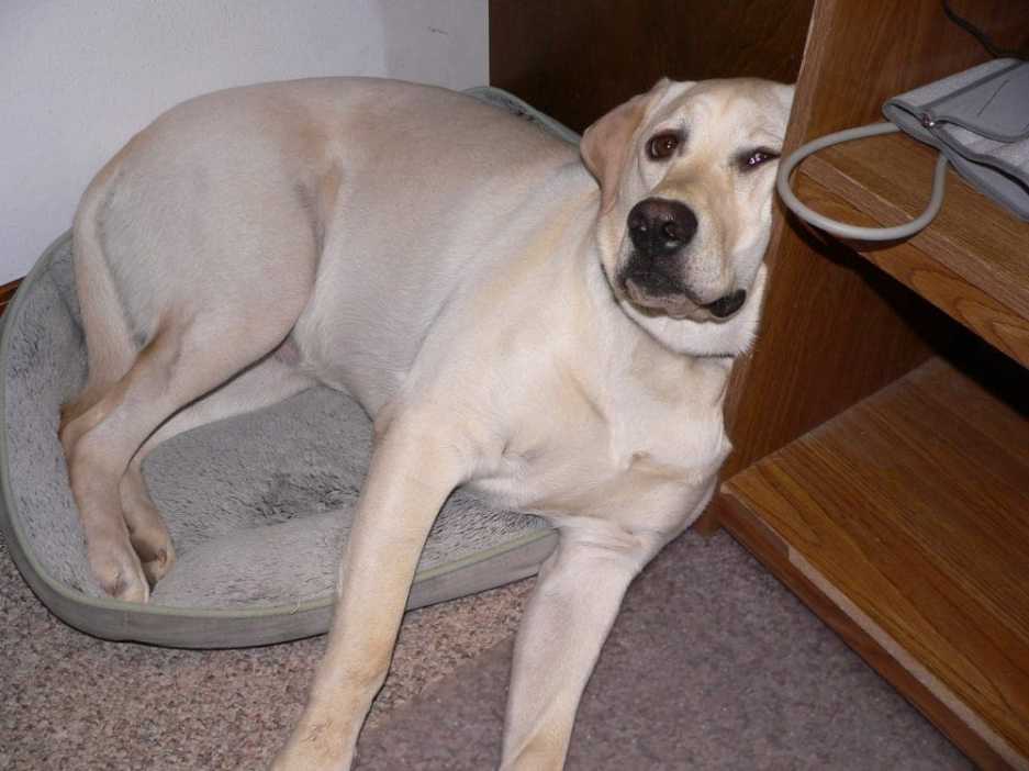 Amber doesn’t seem to realize (or care) that she is too big for this bed. She has one just across the room that is large enough for both dogs. Just a moment ago Molly was asleep in the bed and Amber pre-empted her, barging in and lying down on the bed, oblivious to the fact that Molly was sprawled out in it, asleep. Molly leaped up and left, and is now beside my feet on the floor, sleeping… Amber’s back half is in the bed and her front is all the way out beside the back wheels of my chair. I have to be careful not to move or I’ll run over Amber’s ear!