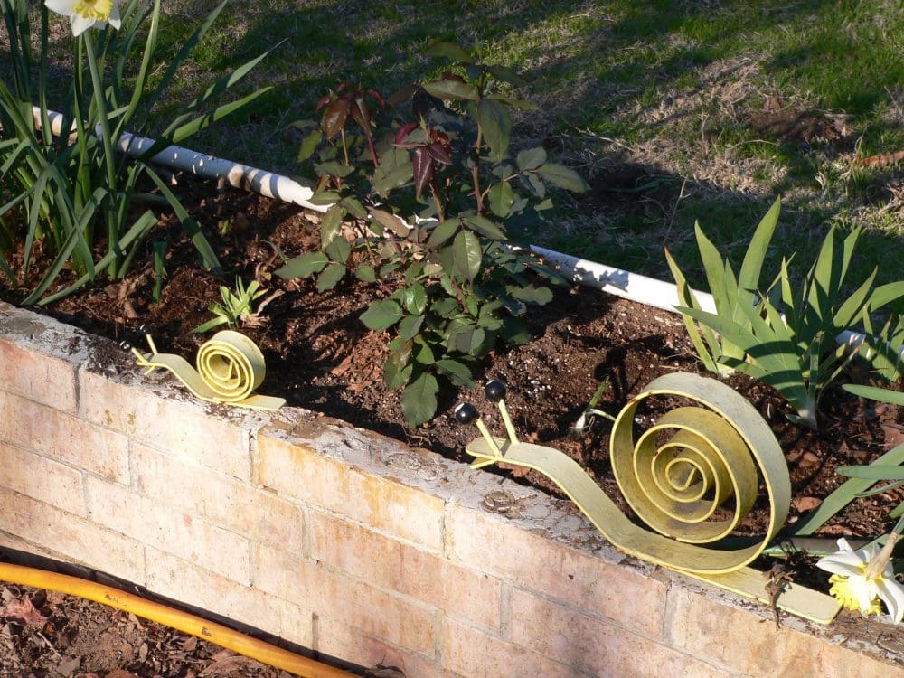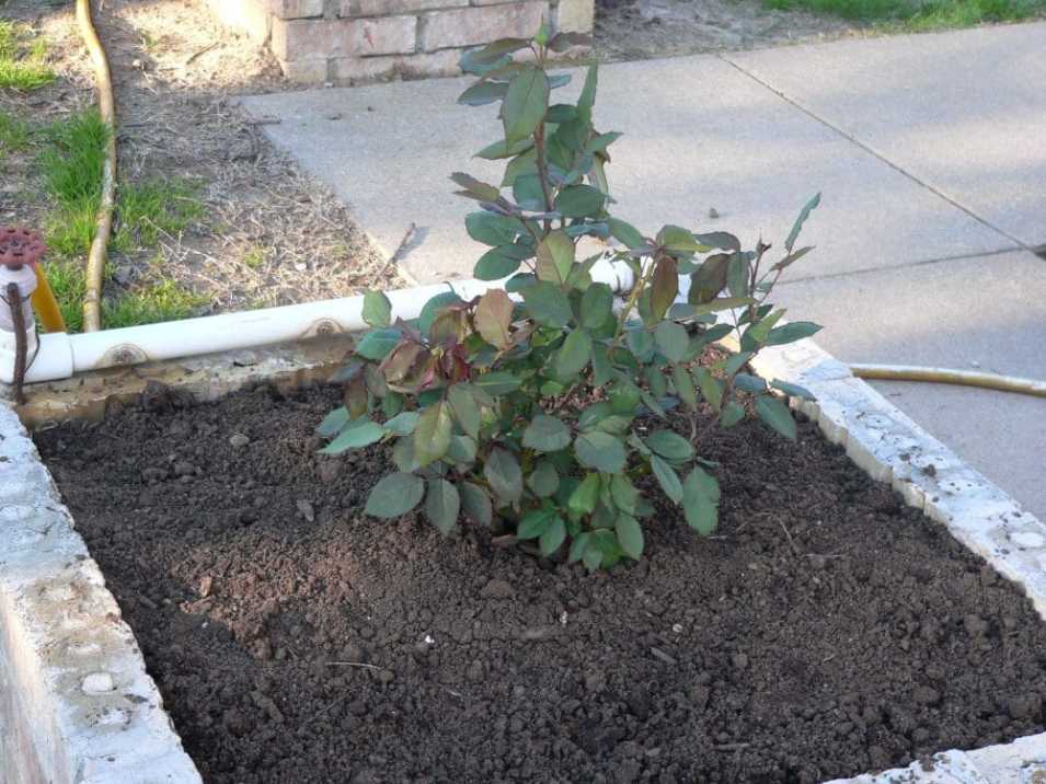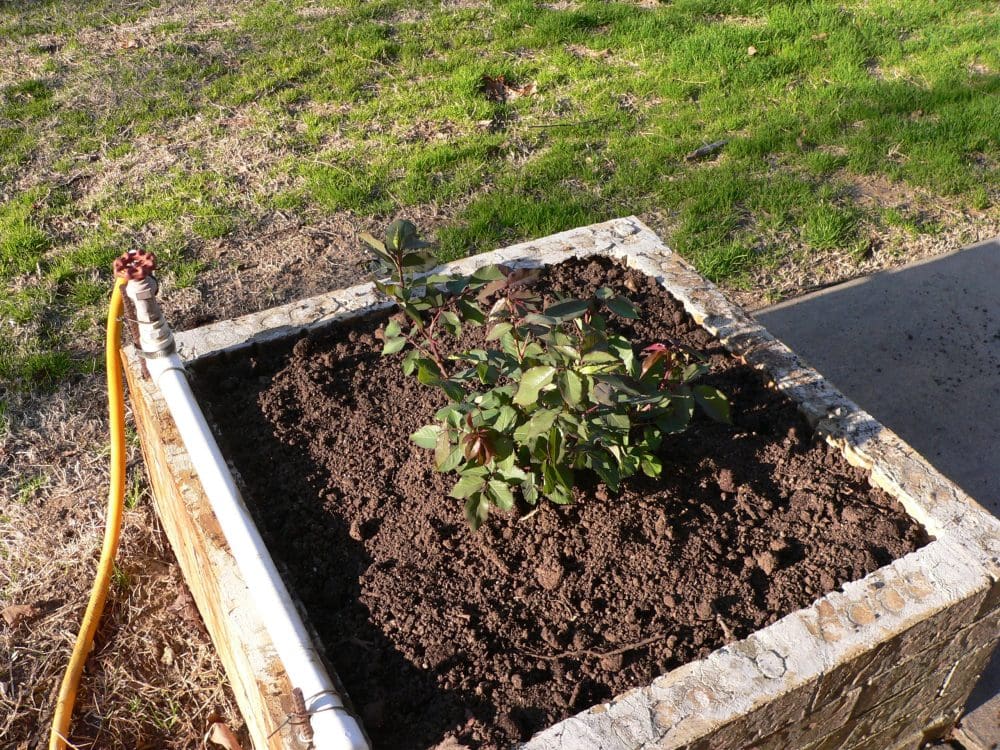 This planting was HARD. We had a yellow forsythia bush that had been here for years. It grew like a mad thing, spreading branches and rooting in all directions. It produced fewer and fewer yellow blooms for a shorter amount of time each year. I spent a lot of time trying to keep it from taking over everything in the planter. I finally got tired of it and asked my husband to take it out and replace it with one of the three rose bushes.  He used a shovel, an axe, and a pry bar, then got a come-along from the shop and attached it to the trailer hitch on the truck to pull the plant out. We still had to cut back roots and keep digging, but we finally declared victory and planted the rose bush in its place.