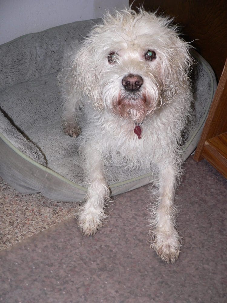 She was SO awful, though, that I couldn’t stand it any longer. I put her in the sink and scrubbed her all over with tearless puppy shampoo (even though she’s 14 years old now.) I always use puppy shampoo because I hate the idea of it stinging if the soap happens to get near her eyes.