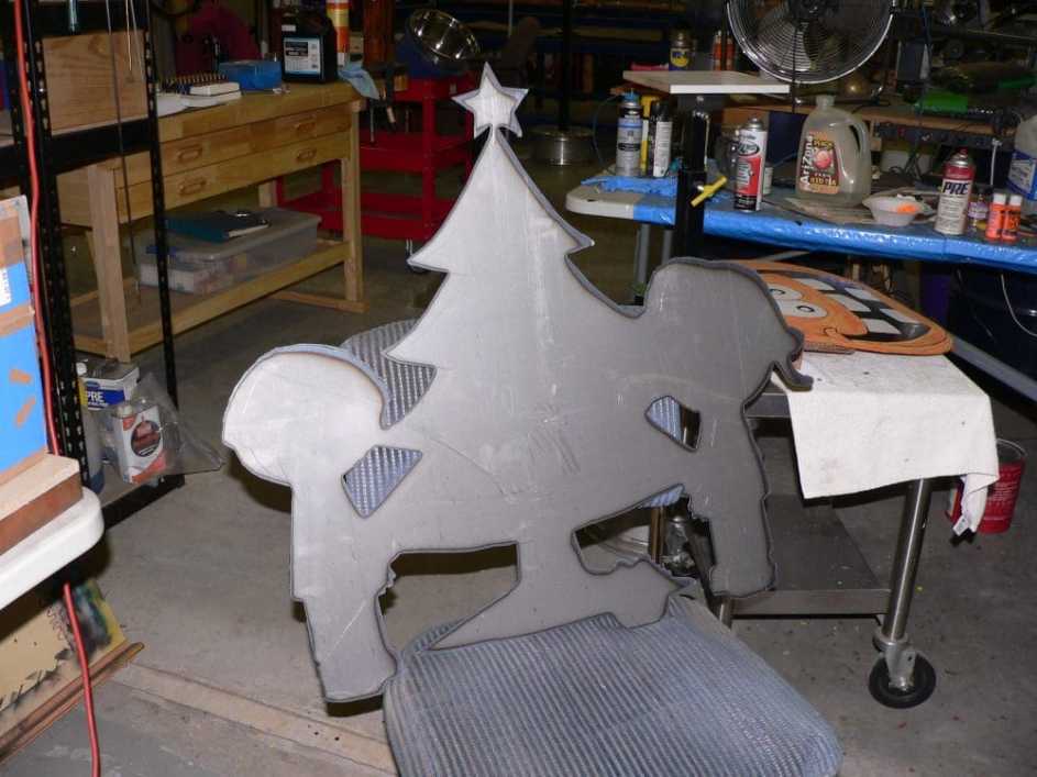 This is what the decoration looks like when it’s ready for me to paint. You can see where the attachment bar is welded onto the design across the bottom. I paint the back of the piece first so that I can work out any problems. The picture above is actually the front of the design. I finished painting the back a couple of days ago. I turned it over yesterday and “color blocked” the front. (I say “color blocked” because it looks really bad when I do the first coat. I’m mainly just marking where each color goes. The paint doesn’t stick well or show up well on the bare metal. On the first decoration we did, I almost gave up at this point because it looked so awful. Thank goodness I discovered that this is the way it is when one paints on metal.