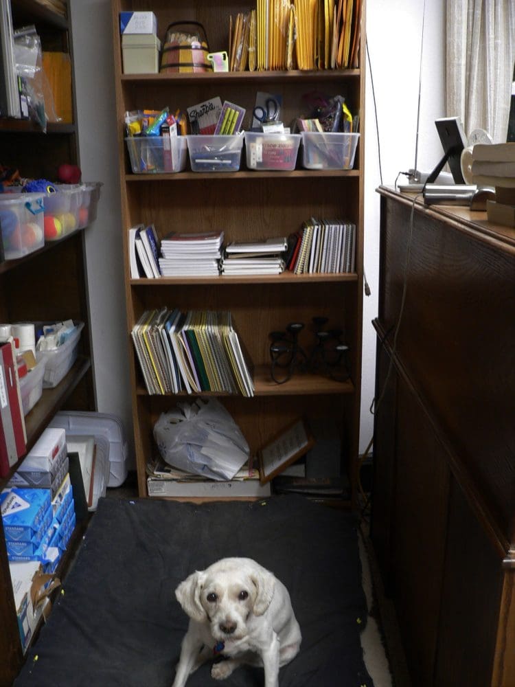 Molly doesn’t enjoy having her picture taken, but my efforts to take pictures of the office woke her up. I finally finished Phase 2 of the office clean out/purge/declutter project late this afternoon. I went through all the drawers and shelves, reorganizing, putting things in the donation pile, throwing things away, cleaning. The above is the office supplies/dog toys/dog bed area.
