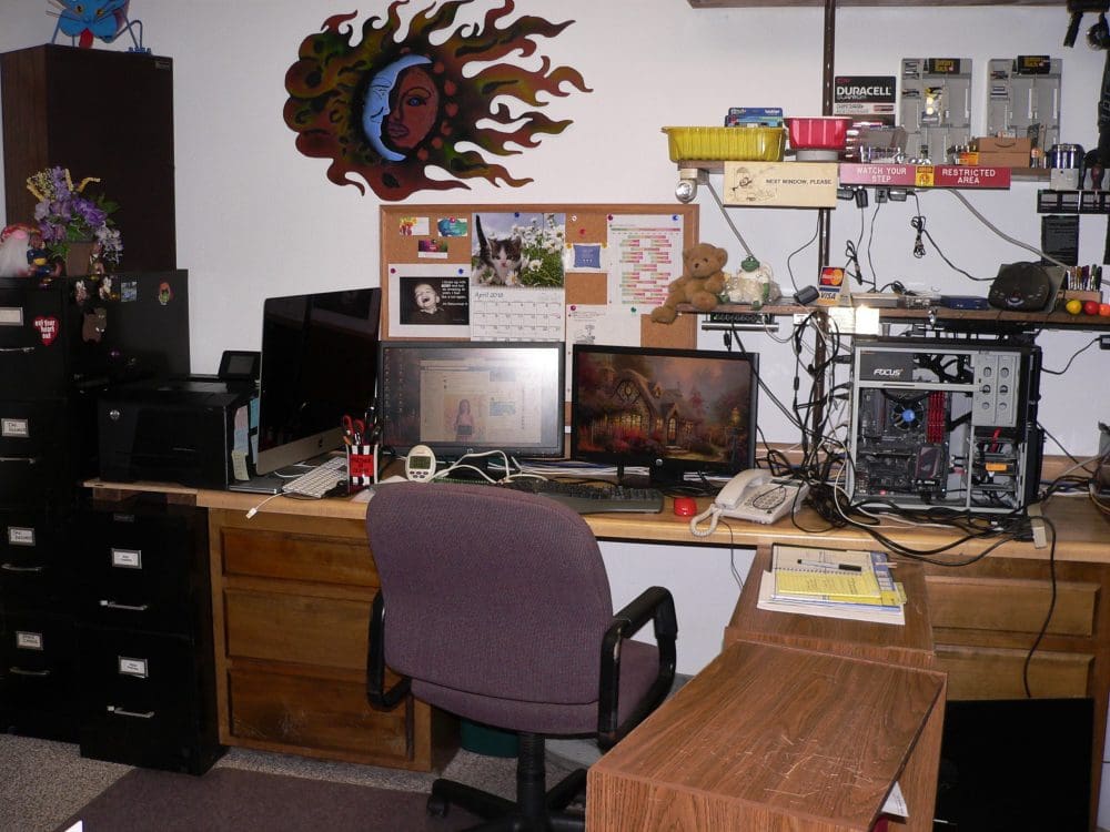 This is my computer area. I cleaned out the drawers on the left of the chair and the shelves to the right of the chair. The only things left are to put the new PC tower under the counter and reroute the wiring, plus wipe the MAC to the left of the monitors and box it for sale.