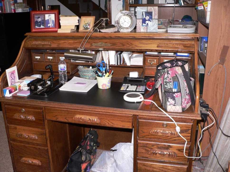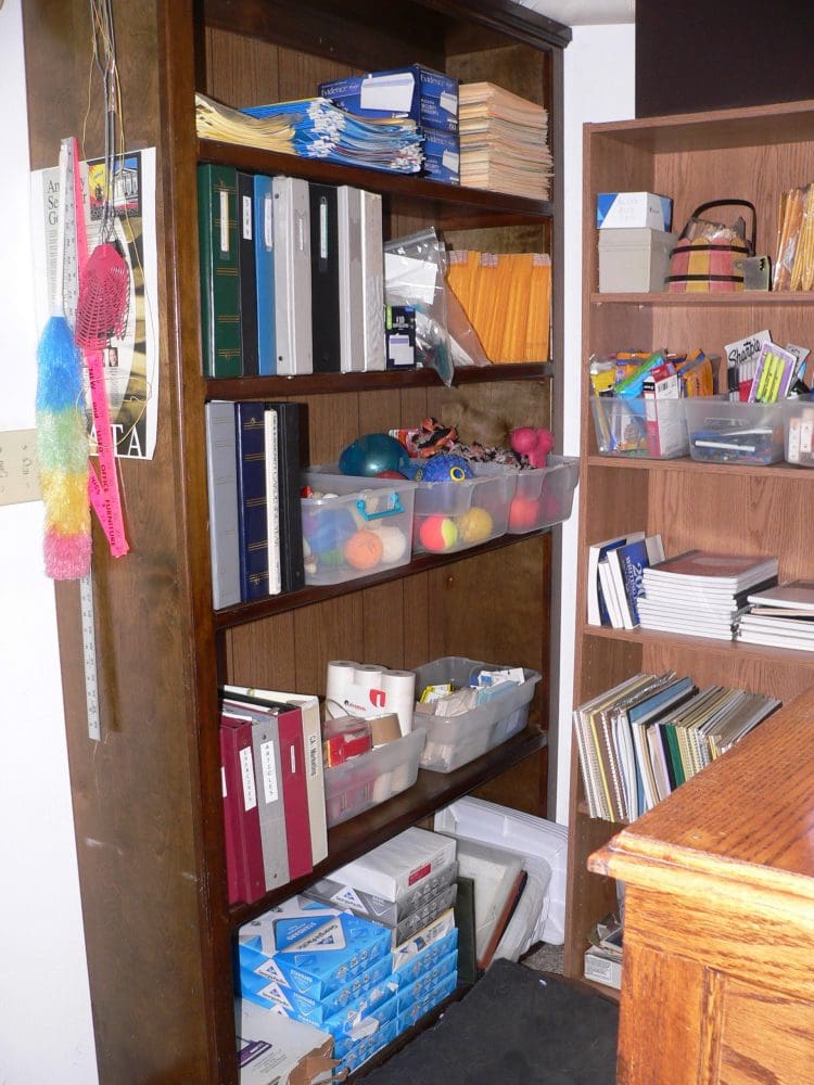 These shelves are between my desk to the left and the file cabinets and my computer area to the right. I went through all the file cabinets, too, except for the one on the other side of the room. We have two four-drawer file cabinets, one 2-drawer, and then my desk has a file drawer on either side.