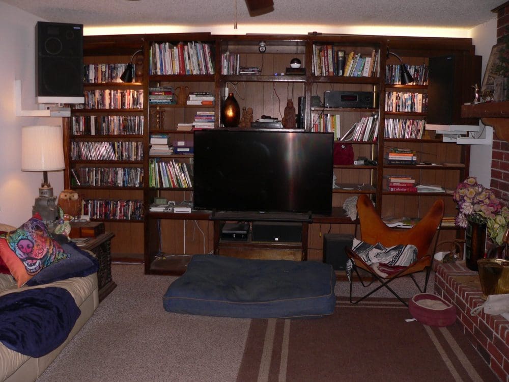 THING THREE: We have a wall of built-in shelves on one end of our living room. We use it as an entertainment center, housing speakers, DVDs, books, TV, etc. I’ve been ignoring the fact that this area needs some purging, as well as re-arranging and cleaning. I’m going to try to at least get a good start on that today.