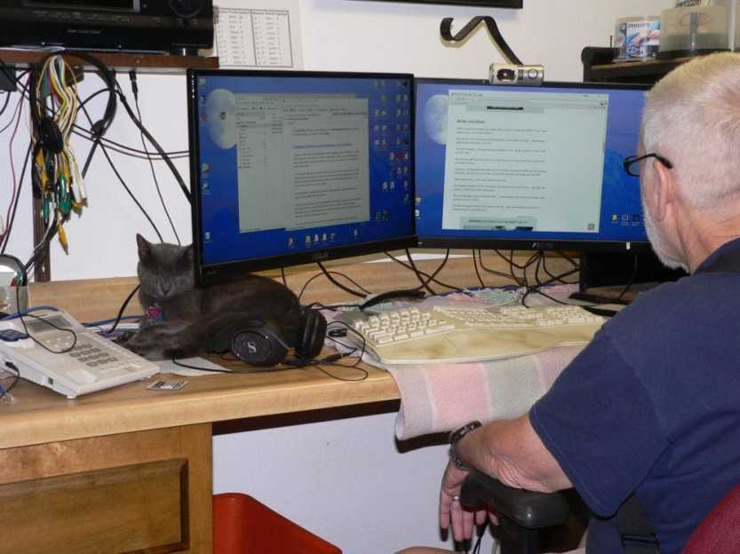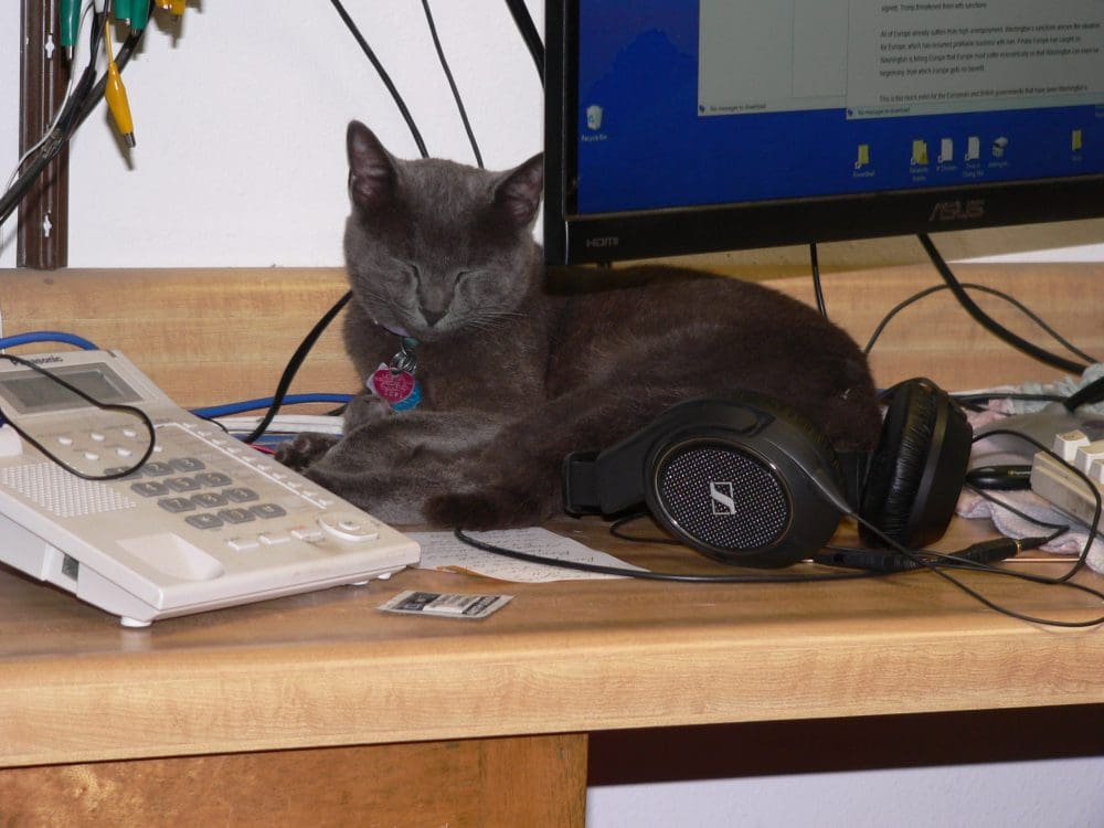 This is Smoke, keeping my husband company while he works at the computer. She calmly jumps from the floor to my husband’s lap. If he’s accommodating, she settles down right there. If not, she then walks across the keyboard, creating some havoc, to find a comfortable spot to take a nap.