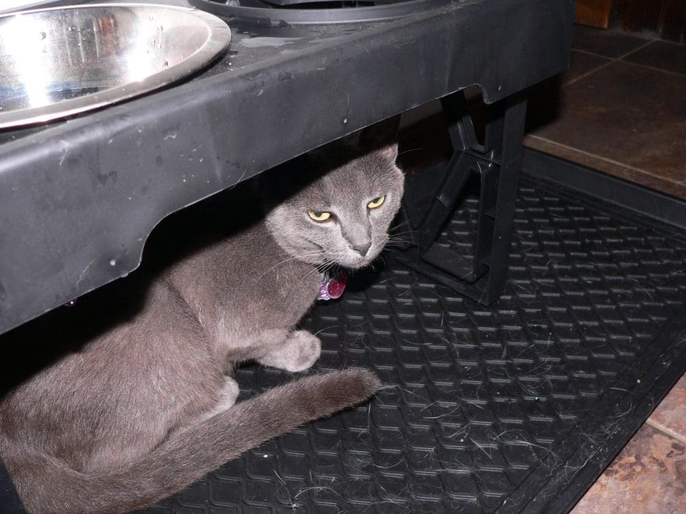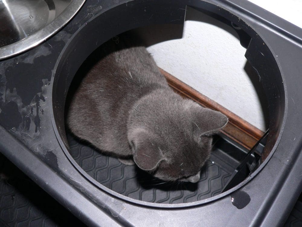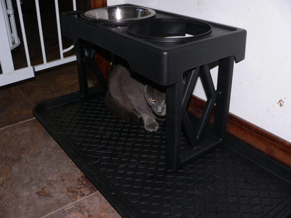 We got a new food and water bowl set up, and then put a tray under it, trying to get Amber to give up her ‘play-in-the-water-dish’ game. So far, it has worked pretty well. Having the water bowl up in the air seems to take it out of the toy category. Fingers are crossed that this continues. Meanwhile, Smoke decided this morning that this was a grand new place to sleep! She even stayed there as Amber stuck her head down through the hole where her food dish goes to check Smoke out.