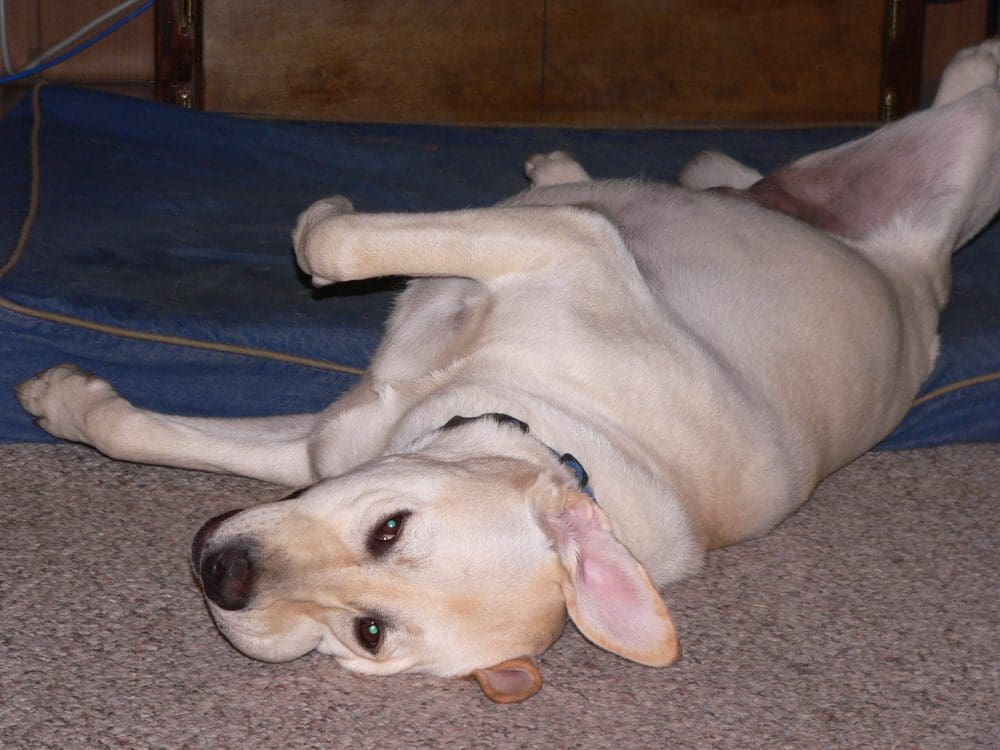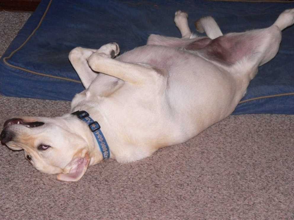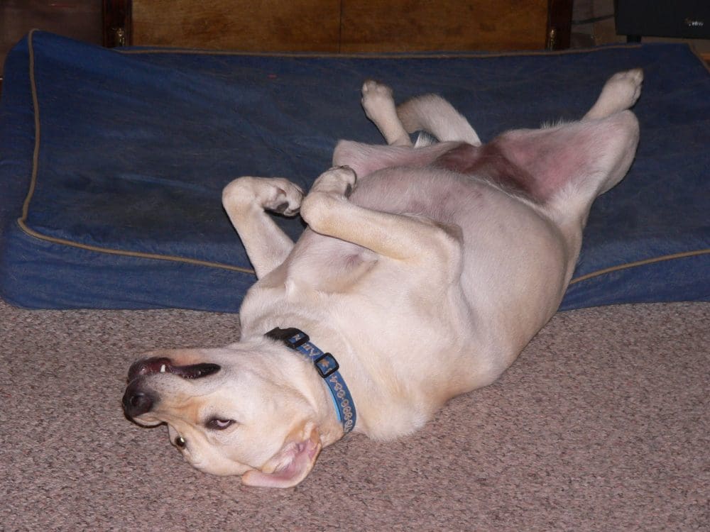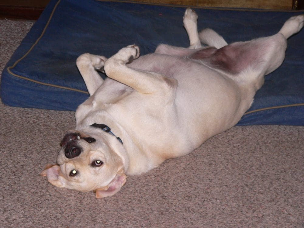 Amber took advantage in the rain let-up for a minute to take a swim in her clean kiddie pool, thanks to my scrubbing it out yesterday and refilling it.  She is now wet and happily sprawled out in the foyer, taking a nap.  I took some pics last night that I wanted to share. She has taken to sleeping upside down, back legs sprawled, half-on and half-off her bed n the evenings while we watch TV or a movie.