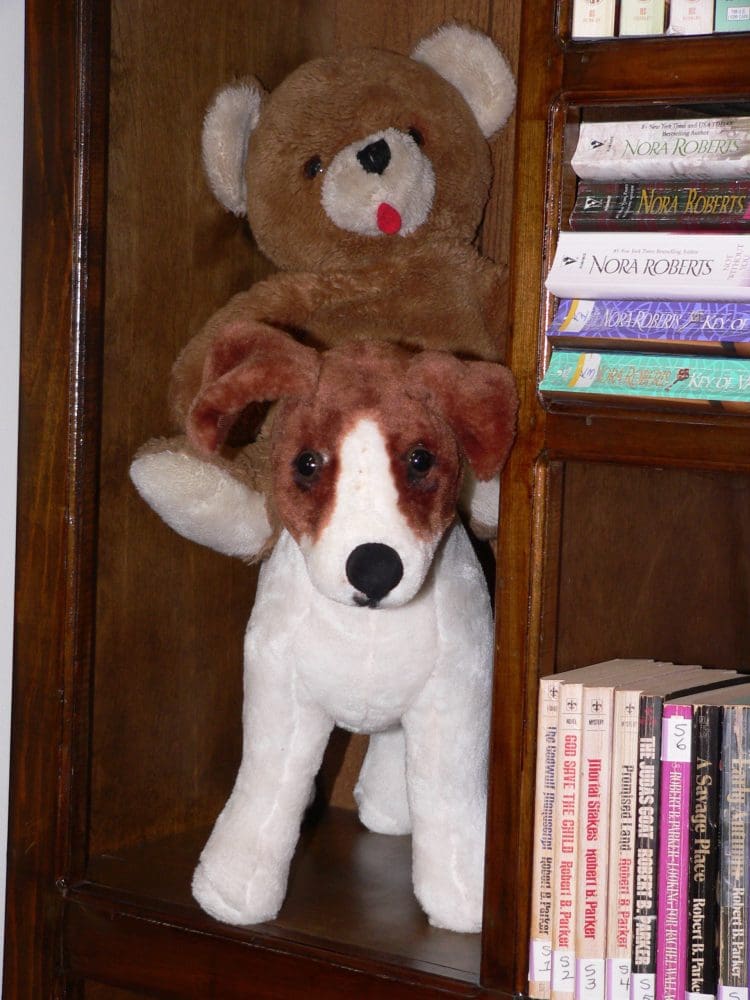 Today I was in our guest room going through books for possible sales and Amber pushed the door open with her nose. She came in happily, looking all around the room, licking me on the arm. Suddenly her hackles rose on her butt and on the back of her neck. She saw this –