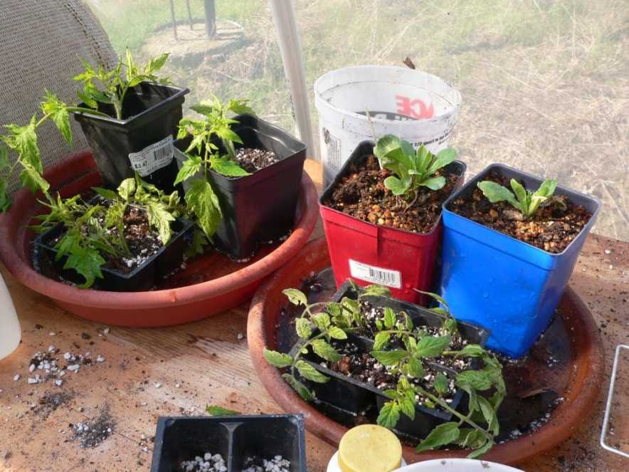 I just read about tomato plants in my greenhouse book. He suggests they need a LOT of air circulation around each plant, so I think I’ll go back out and move them from the 4 and six-pack planters to each in a 3-4″ pot to give them the best chance possible.