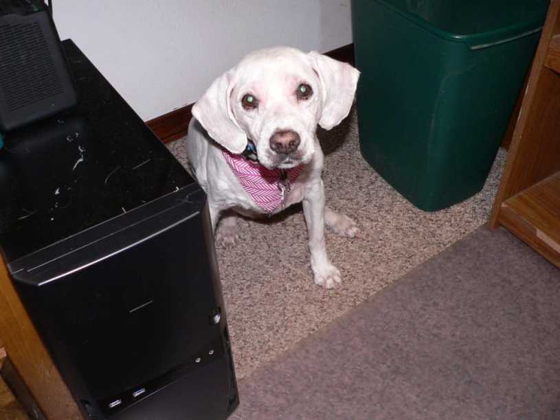 The receptionist said she was a ‘good girl,’ so she got a cookie a minute ago and is now spreading out on the dog bed in the living room after drinking a ton of water.