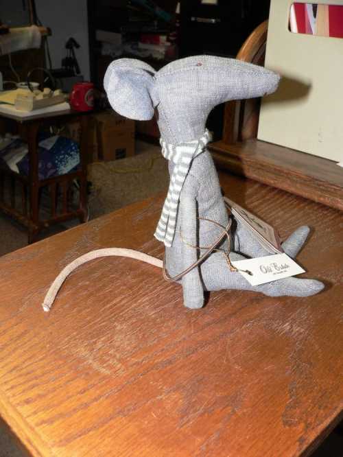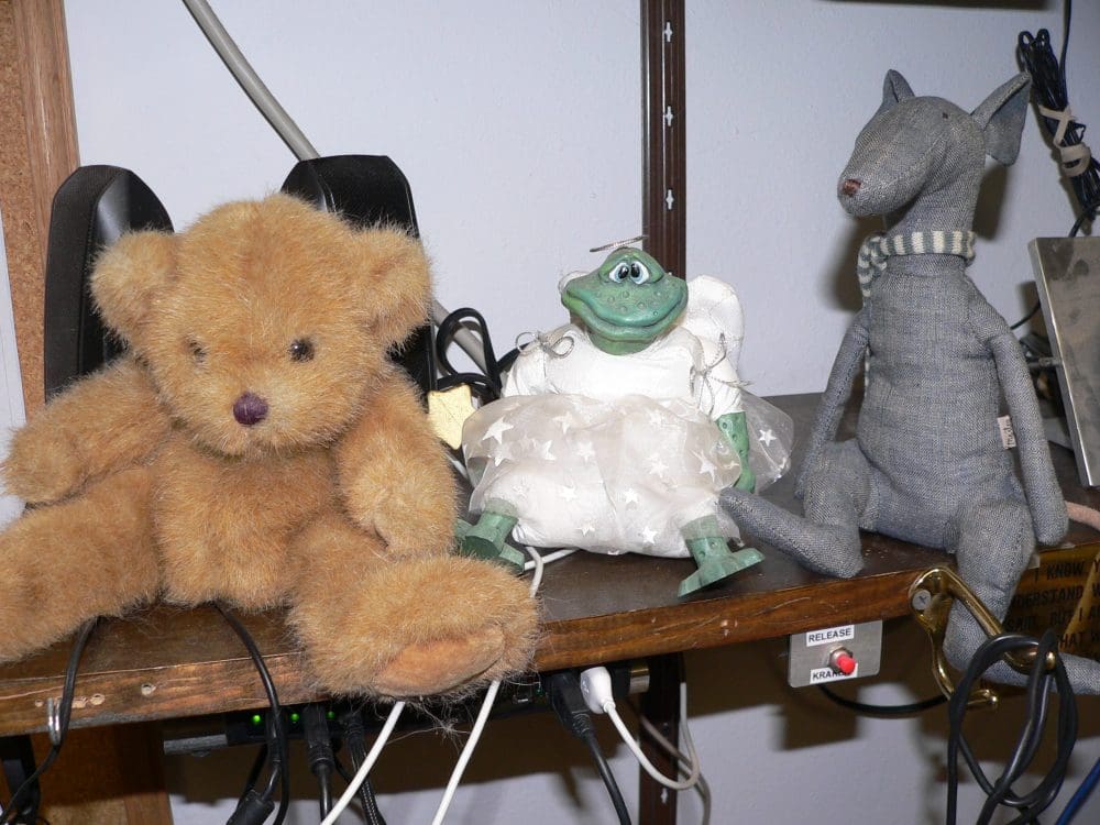 I have several shelves in the office above my computer area. I already had the little, totally flexible and pose-able teddy bear, and my ceramic and fabric “Fairy God Frog” there, and now the “Cool Rat” has joined the family of things that make me smile.
